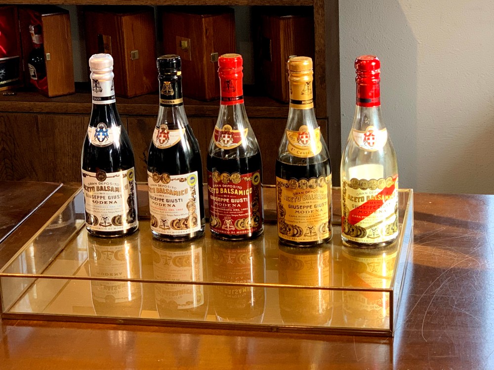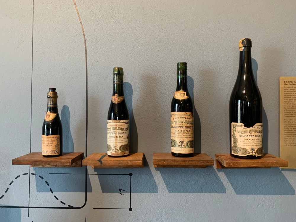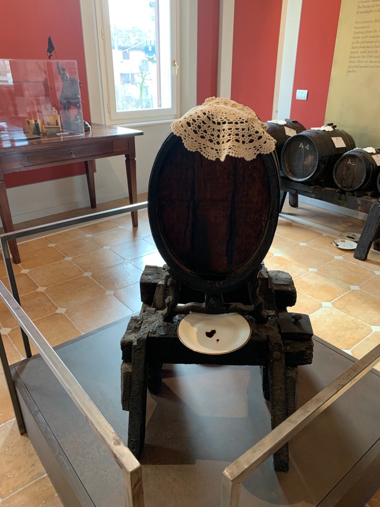 We arrived at the tasting and first did a tour through the museum learning about the history of the family and how they make their vinegar. Balsamic vinegar starts with grapes, just like wine, but the main difference is that the grapes are cooked to produce the vinegar. The liquid is then aged in barrels of varying sizes. I thought it was interesting that each year as part of the liquid evaporates, the vinegar maker will steal liquid from the next biggest barrel with a thief and transfer it to the smaller barrel. This process continues and eventually the last and largest barrel can end up with a reduced amount of liquid so a different mixture of grapes is added. The smallest barrel ends up being the most pure and also the most pricey.