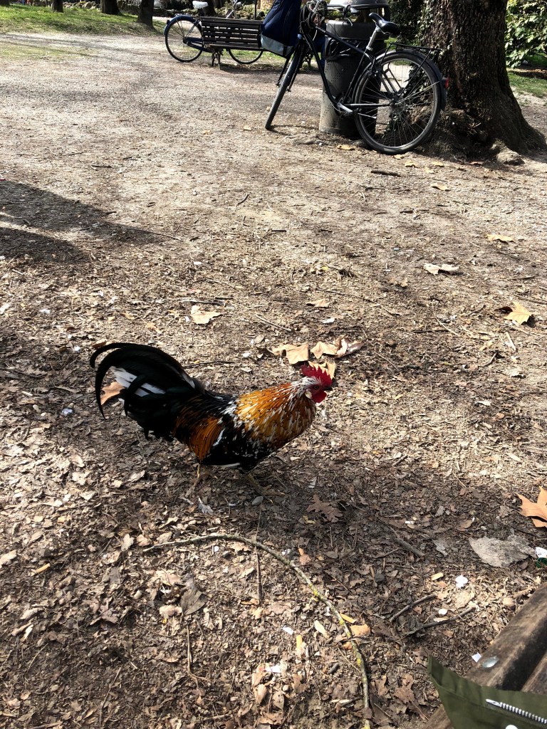 We ate some lunch in a nice green park, while watching a rooster roam.