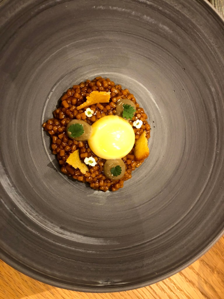 Farm egg yolk on wheat stew and coal grilled vegetable sauce