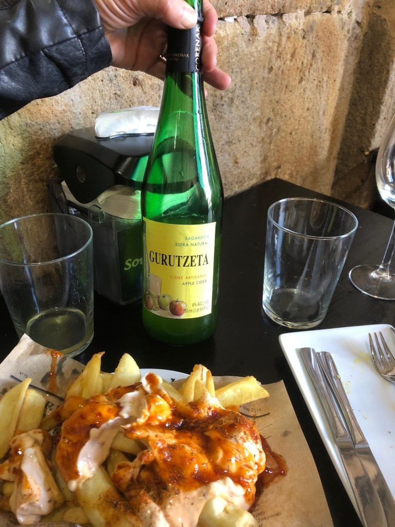 At Sorginzulo we had patatas bravas and some kind of seafood. Apparently, you can order off menu and get the really good stuff. The sauce on the patatas was so creamy and kind of tasted like Big Mac sauce. This is also where Tyler learned how to pour his own txacoli. We got a bottle of the stuff and all practiced our pours. It is harder than it looks.