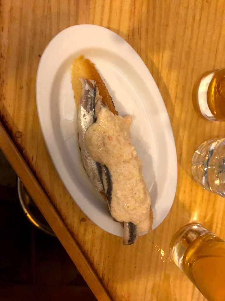 Then we went to Victor Montes and tried this incredible squid ink croquette. It looked disgusting and I definitely would not have ordered it myself, but it was amazing. Here we also had txacoli, the local white wine which they pour from high above to get some carbonation. My favorite wine of the trip.