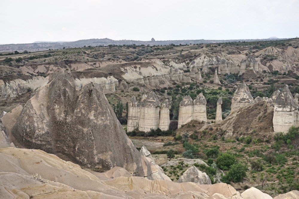 Because of the rain, we didn’t stay too long to look at all of the volcanic rock formations, and we made our way straight to Love Valley. The Love Valley is special. A valley of several fairy chimneys in a phallic shape. What is a fairy chimney, you may wonder? These strange rock formations were formed millions of years ago when volcanic eruptions rained ash over Turkey. The ash hardened into a tough, porous rock that was covered by a layer of basalt. Erosion over millions of years wore the softer material down into long columns of rock that had a mushroom cap at the top. And that’s how you make a fairy chimney.