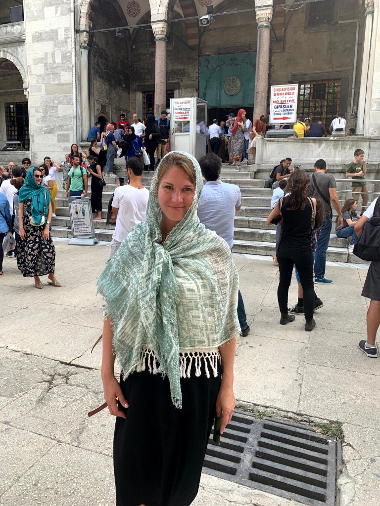 Next, we popped over to the Blue Mosque, which was also under construction. Here, you had to cover your legs from the knee up, cover your shoulders, and women had to cover their heads to enter. Luckily, I knew this in advance and brought a scarf to wrap around my head and shoulders. My skirt was long enough to meet the requirements as well. Tyler had to borrow a wrap because his shorts were too short. There was a long line to get in, and you had to remove your shoes and carry them with you in a plastic bag – luckily we both had socks on.