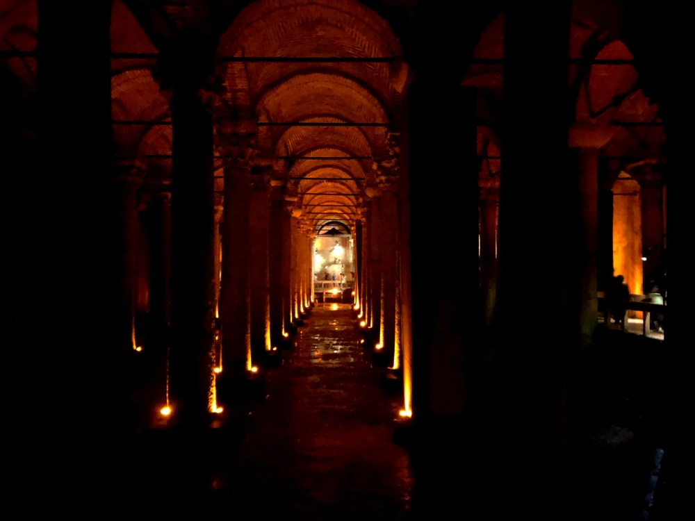 We also visited the Cistern Basilica, which is the underground water source of Istanbul. It is, like most of the other things in the city, under construction, so there was no water in it. Normally, the water runs downhill from a place about 20 km outside of the city, and back in the day to test the water quality, they used to have fish in the water and if the fish were alive, then the water must be safe to drink. I enjoyed walking around underground because it was cooler temperatures. There was also some cool architecture. There are like 12 rows of 28 columns holding up the roof and some of the columns have fun designs – like medusa heads.
